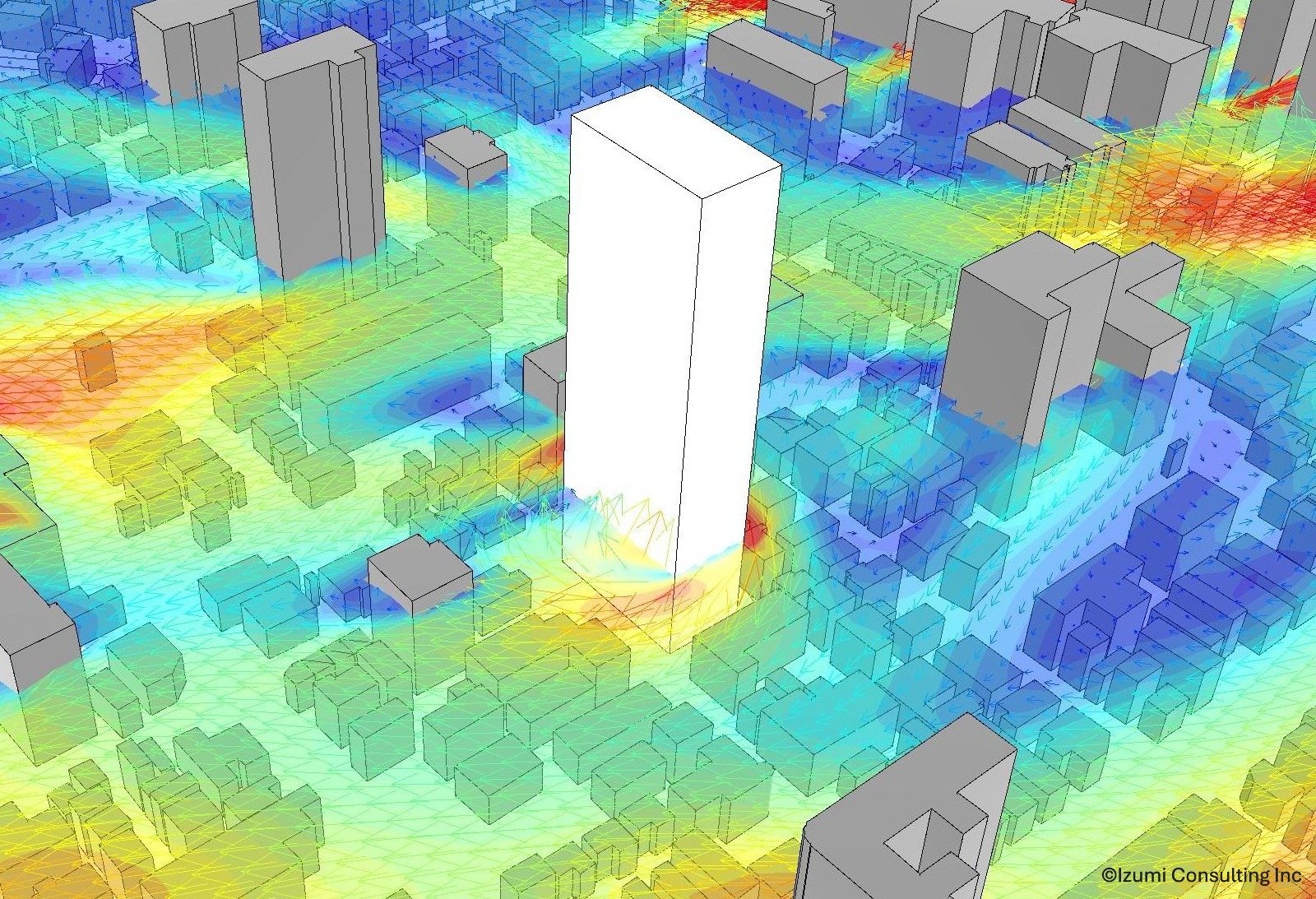CFD(数値流体力学)により、建物周辺の風環境を解析し風の流れを可視化します。建物建設前後での建物周囲の風環境の変化やビル風などの検証が可能です。設計時の検討や総合設計制度を利用する際の風環境評価、近隣説明用の資料などにご活用ください。