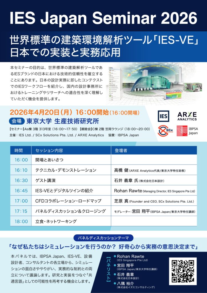IBPSA Japan、IES-VE、設備設計者、コンサルタントの各立場から、シミュレーションの面白さややりがい、実務的な制約との両立について議論し、研究と実装をつなぐ「共通言語」としての可能性を再考する機会とします。